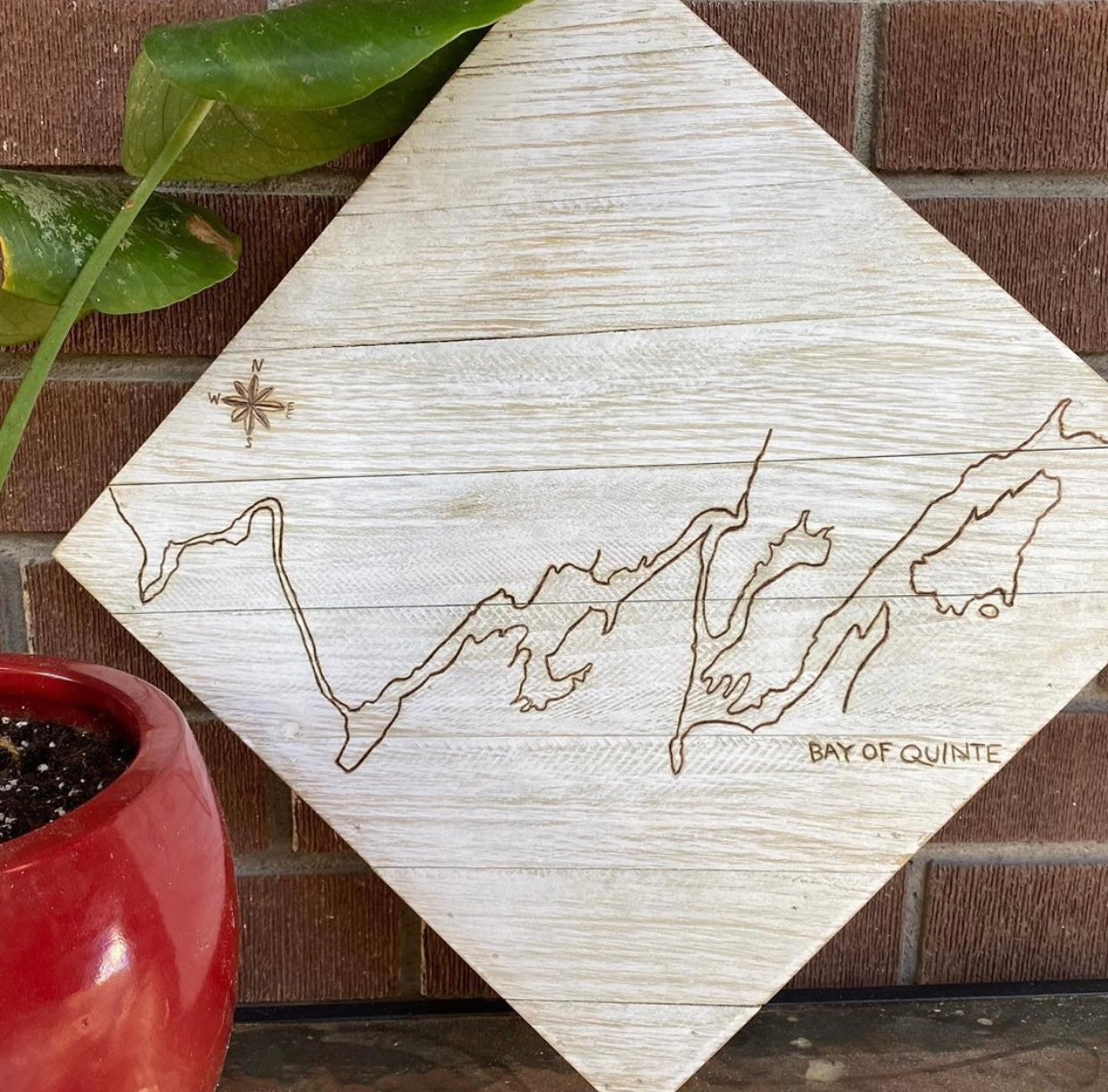 This one of a kind piece was designed for a colleague who developed 60 unique masks for her colleagues (I'm one of them). She was SO happy to receive her wood map art piece, that she started showing us where she stalled on the Bay of Quinte and had to be rescued by the Coast Guard. Some map memories are just too good not to share.